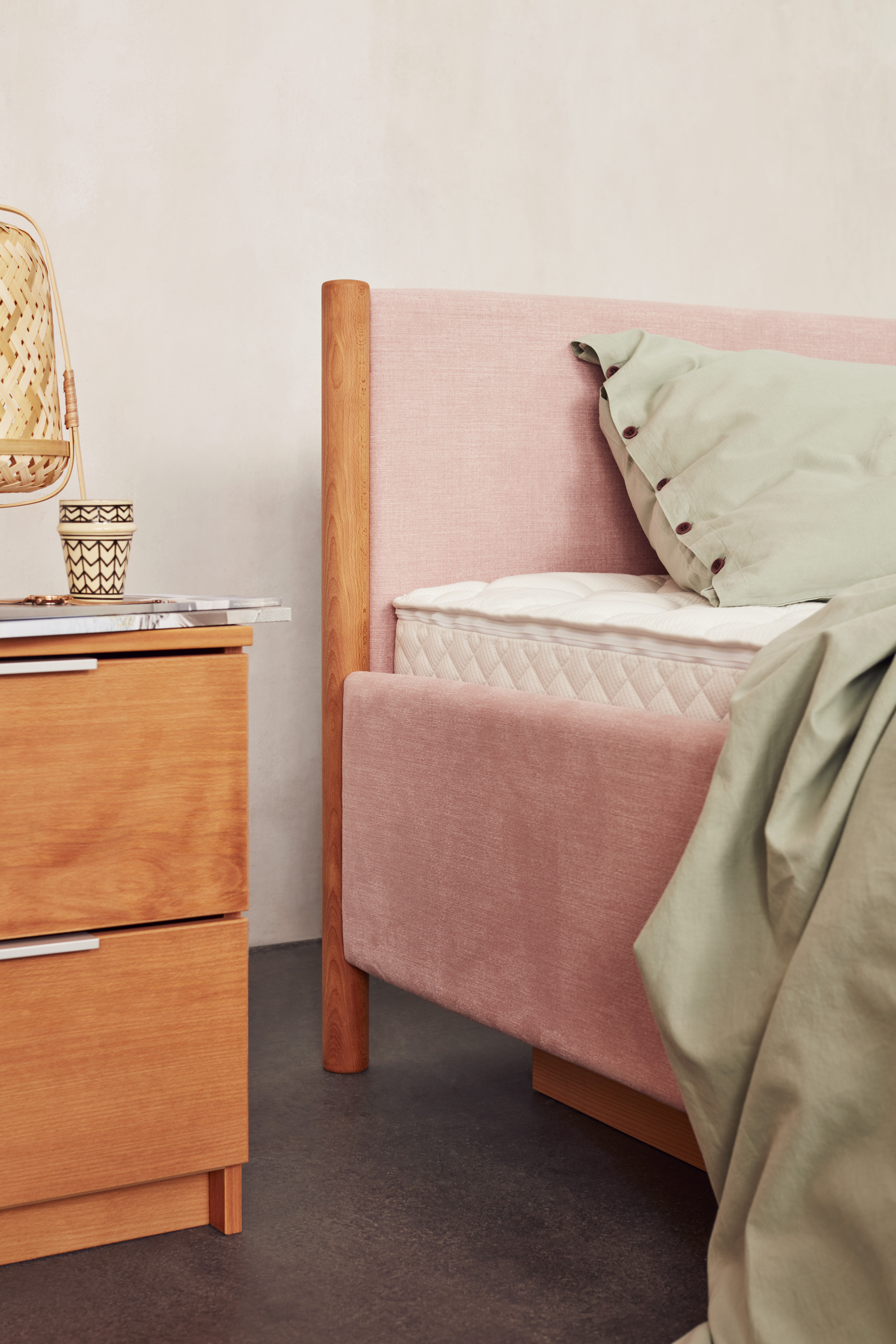 Die weiche, taktile Polsterung trifft auf die natürliche, unpolierte Schönheit von Massivholz und schafft ein harmonisches Gesamtbild, das Ruhe und Geborgenheit ausstrahlt – perfekt für ein modernes, nachhaltiges Schlafzimmer.